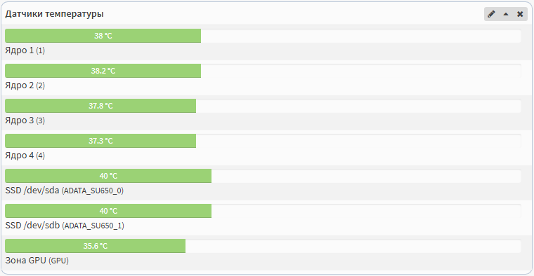 Виджет Датчики температуры отображает текущую температуру внутренних элементов: CPU (по ядрам), зоны GPU (системная плата), SSD накопителей (ПЗУ).
