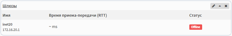 Виджет Шлюзы отображает информацию по настроенным шлюзам: Имя, IP-адрес, и, при активированном мониторинге шлюза, Время приема-передачи (RTT) и Статус.