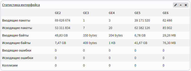 Виджет Статистика интерфейса показывает статистику по трафику на каждом порту: Входящие/Исходящие пакеты, Входящие/Исходящие байты, Входящие/Исходящие ошибки, Коллизии.