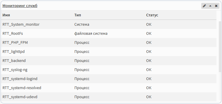 Виджет Мониторинг служб показывает активные службы и их статус.